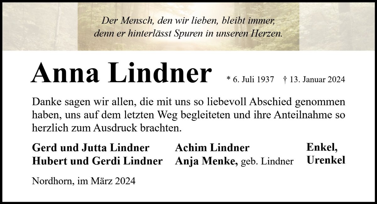 Anna Lindnergestorben am 13. Januar 2024
