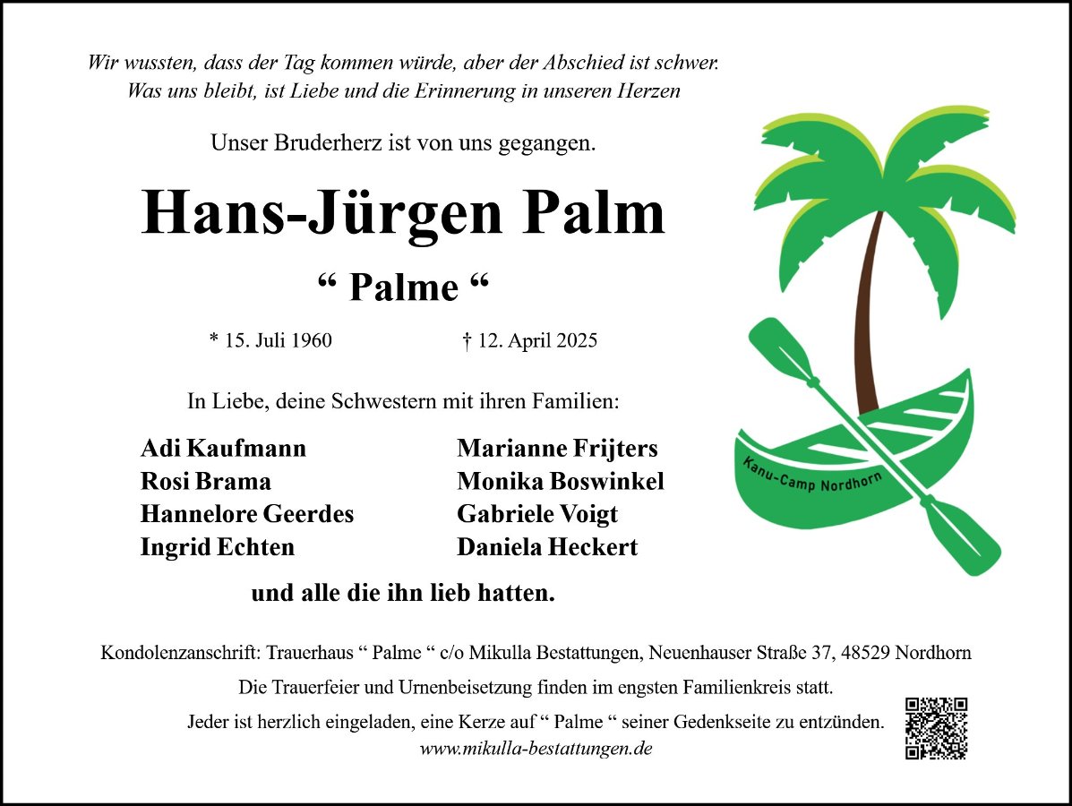 Hallo Palme 🌴 nun war es doch dein Ende. Kaum zu glauben du warst nach der Diagnose noch so stark. Ein Krebs, besiegt immer den Krebs. Ich weiß du bist jetzt da wo du immer sein wolltest.Weil ich daß weiß, werde ich nicht weinen sonder mit dir lachen. Wir werden uns dort bestimmt wieder sehen. Das einzige was ich bedauere ist das ich soviel Male angerufen habe und dich nicht mehr erreichen konnte. Da wo du jetzt bist hast du deinen Frieden in mitten deiner indianischen Traumwelt. Mit der Natur, deren Rituale und der Musik . Eigentlich kann ich mir kaum vorstellen nicht mehr mit dir zu reden. Wir haben uns gegenseitig immer soviel Kraft gegeben. Mal schauen als wir noch zusammen gearbeitet haben wußten wir faßt immer was der andere sagen wollte. Geh mit den Ritualen der Indianer in deinen Frieden. 🧡 Manuela